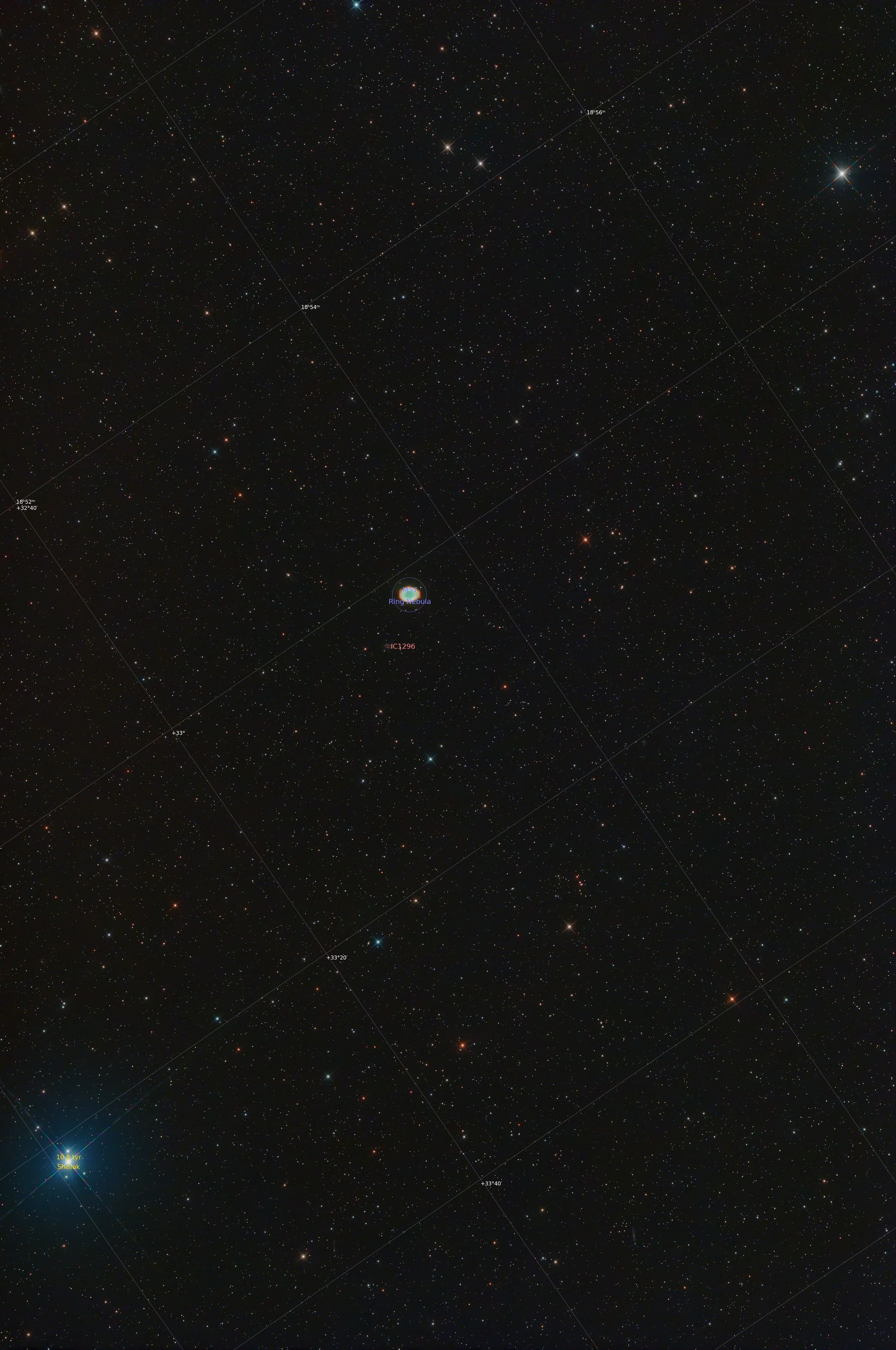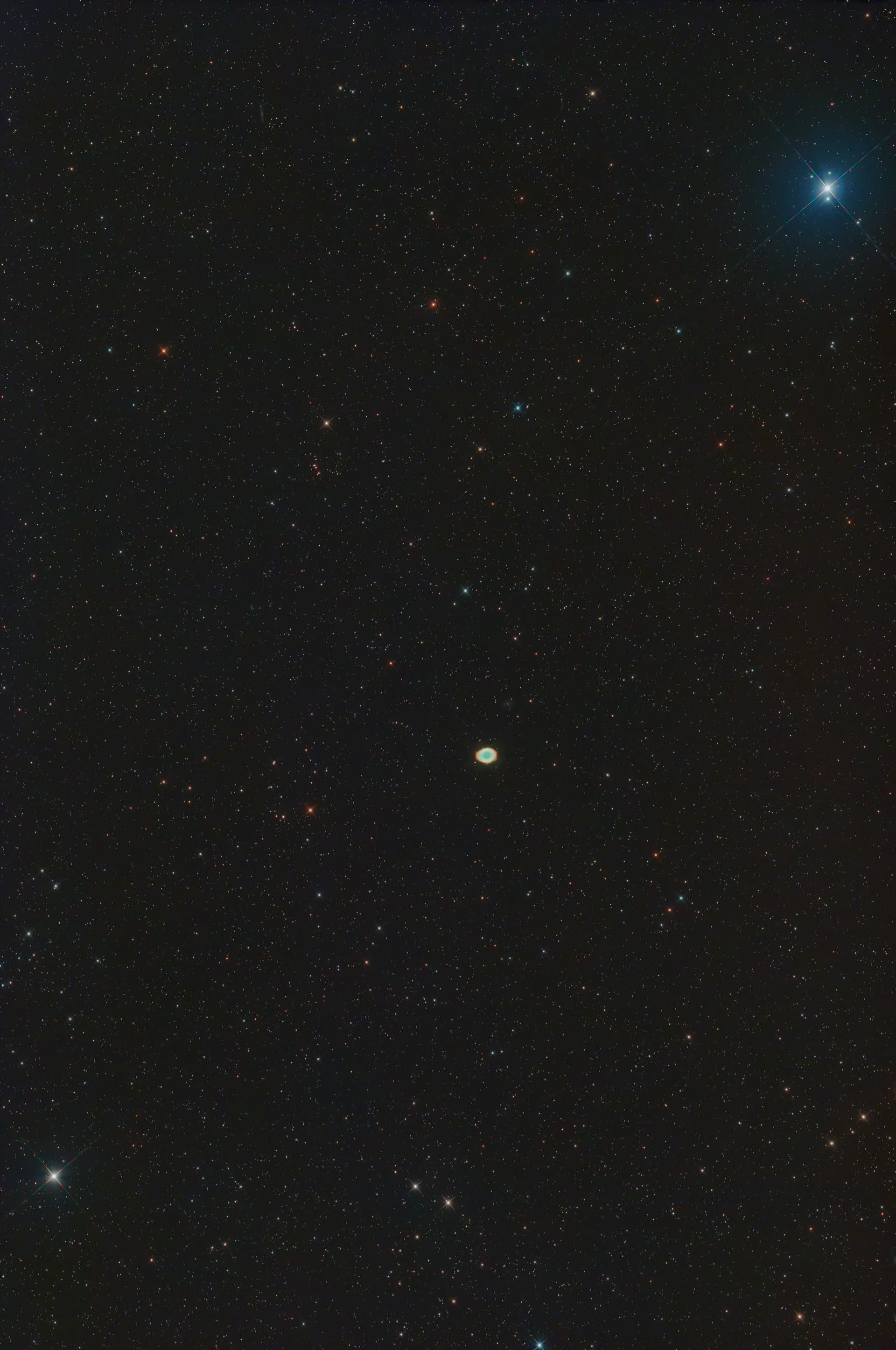 Nessa caso aqui, usei um telescopio SkyWatcher Quattro 200P (200mm f/4, que dá 800mm de distância focal) com um redutort Starizona Nexus (0.75x), que transforma em um equivalente a f/3 em 600mm de distância focal. Usei um filtro Antlia RGB Triband e uma câmera Ogma AP26CC (colorida). A montagem equatorial foi a Juwei-17 que eu comentei um tempinho atrás.