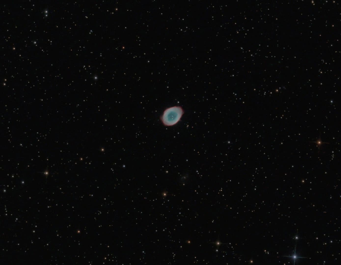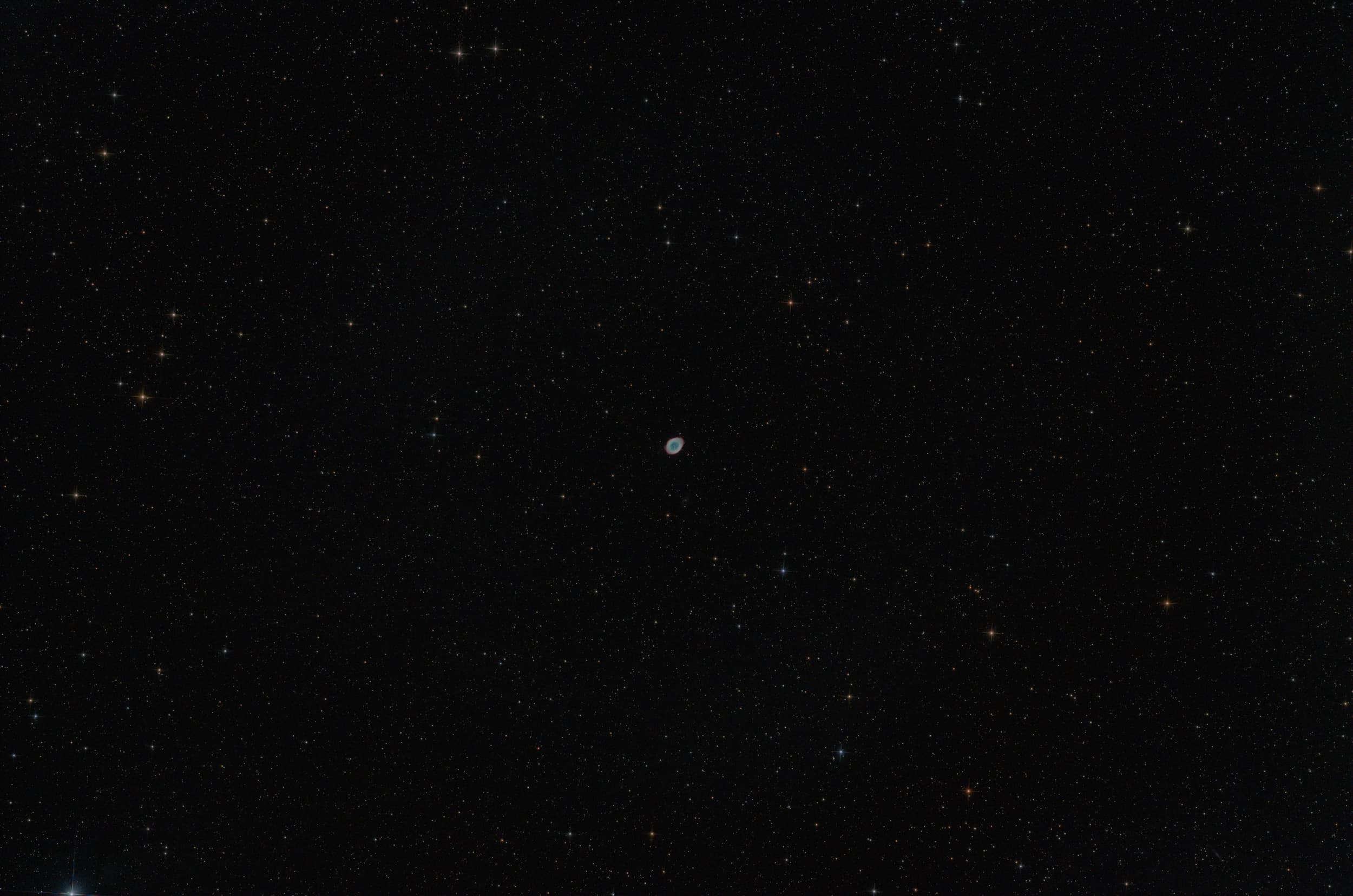 Ela parece pequena no meu maior telescópio (800mm de distância focal, sensor APS-C), então usei uma técnica chamada Drizzle, que é parecida com aquela de algumas câmeras que movem o sensor uma distância de meio pixel pra cima e para o lado, a fim de aumentar a resolução. Este é um crop gigante do centro da imagem acima. Ao fundo ainda se vê a galáxia IC1926.