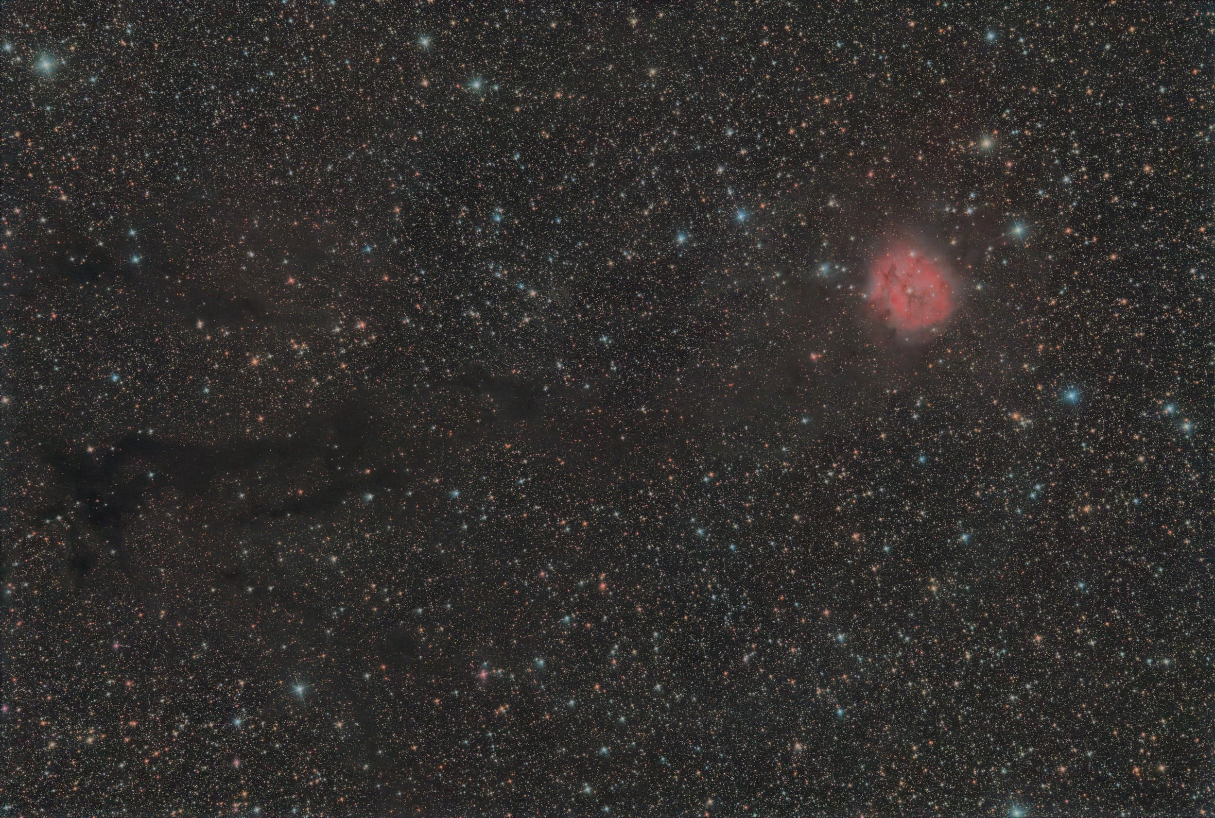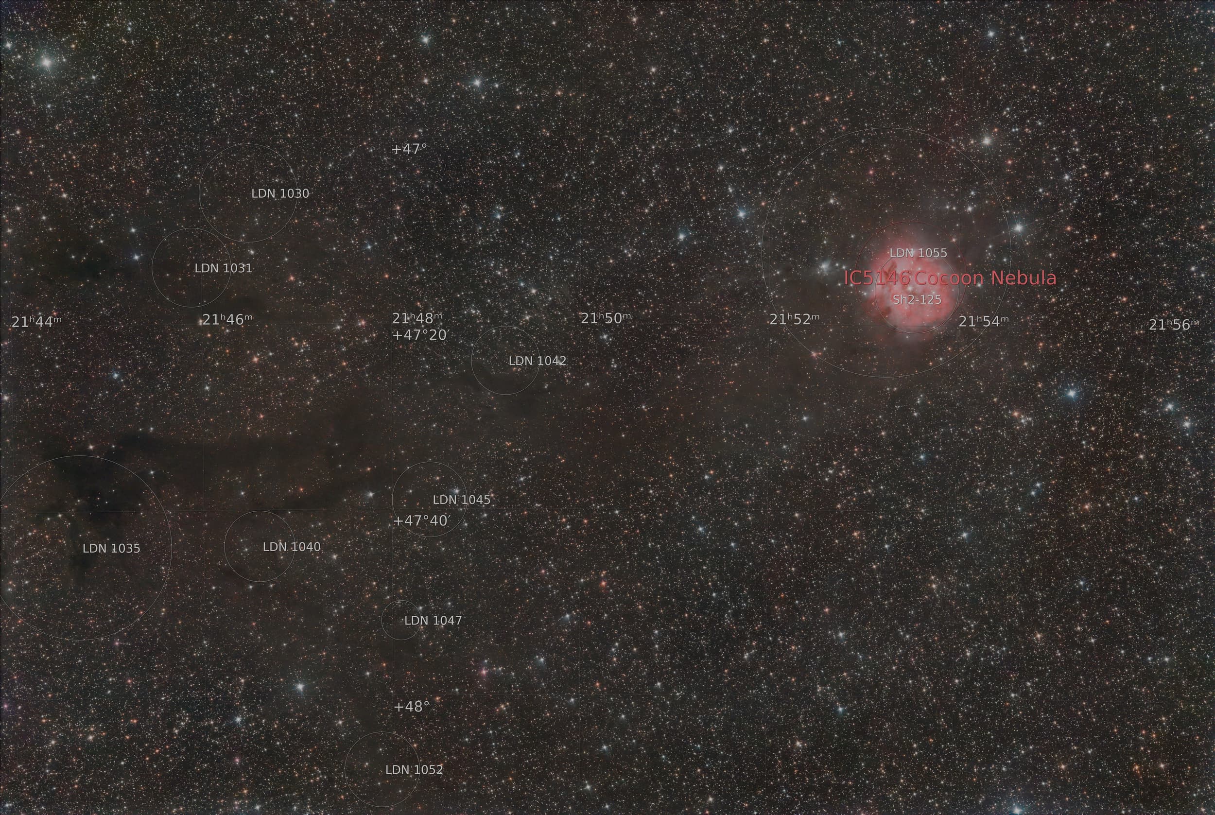 É uma mistura de nebulosas de emissão (a parte mais rosada), reflexão (a parte azulada) e escura (a parte cinza) na constelação de Cefeu. Fica a cerca de 4 mil anos luz de nós, ainda aqui na nossa Via Láctea.