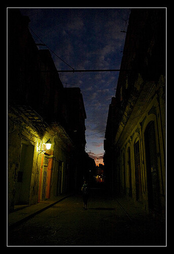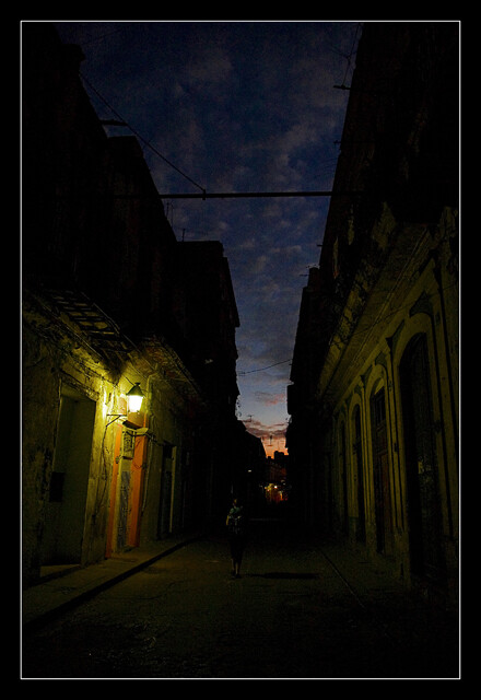 Essa foto foi feita em Cuba. A primeira coisa que me chamou atenção foi o clima da foto. A pessoa andando ao anoitecer pela rua vazia e pouco iluminada em Havana, ilustra uma situação de melancolia, de solidão e suspense. O cenário é ótimo. Lembra algo como um filme noir. Cenário super fotogênico. A iluminação reforça o clima meio sombrio. A gente fica curioso para saber o que esse sujeito estava fazendo sozinho andando pela rua, onde ele iria, o que estava passando pela sua mente. Poderia ser um assassino, um detetive, um cubano voltando do trabalho ou um turista passeando…hehehe. As tonalidades remetem a uma pintura a óleo. O fotógrafo foi muito feliz no registro. Belo aproveitamento da luz. Foto muito bacana.