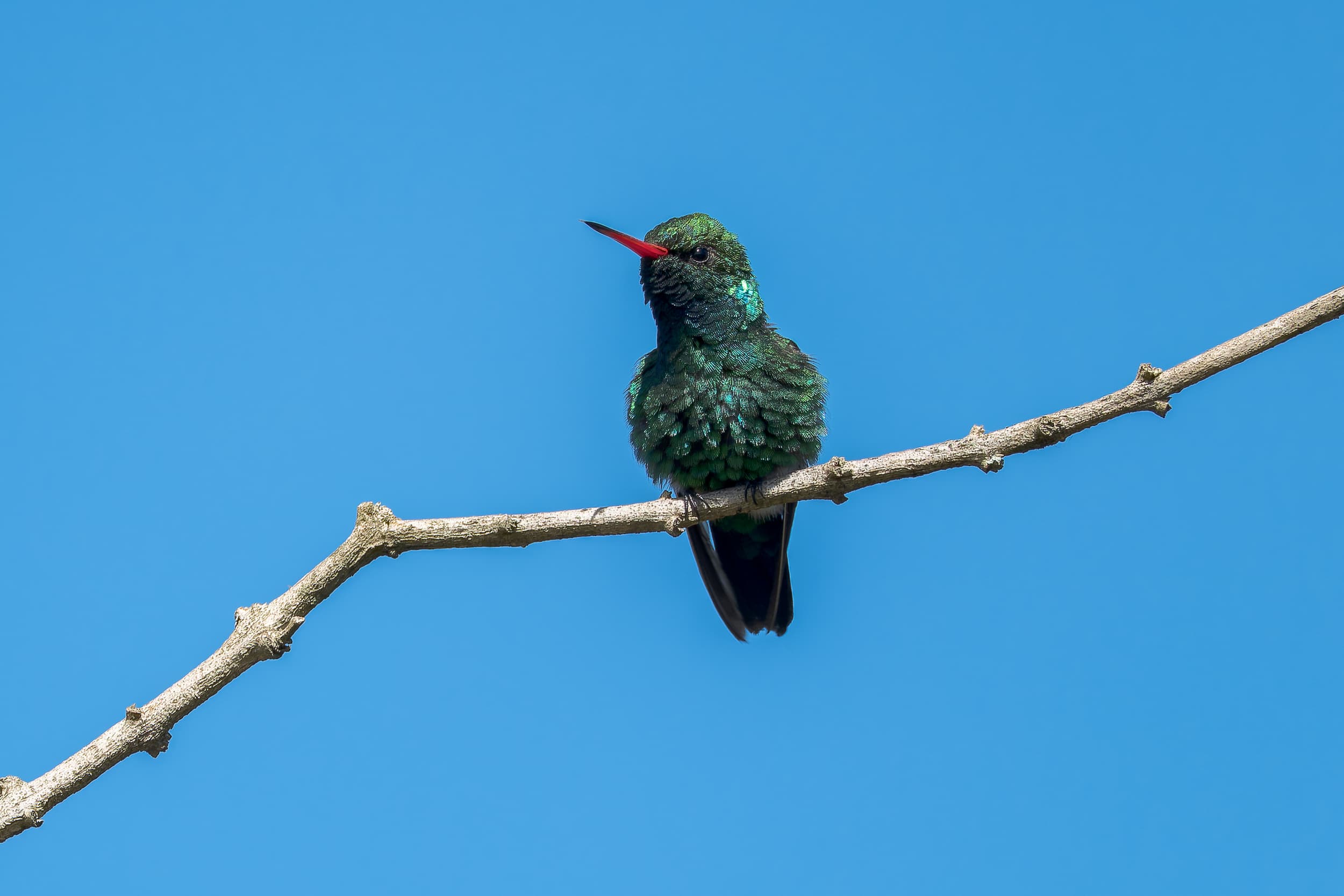 Como seu nome já diz, seu bico é vermelho com a ponta negra. Sua plumagem verde-brilhante abrange as partes dorsal e ventral, apresentando um brilho dourado mais intenso na fronte e mais azulado na garganta. As penas da cauda são de coloração azul metálico iridescente e visivelmente bifurcada.