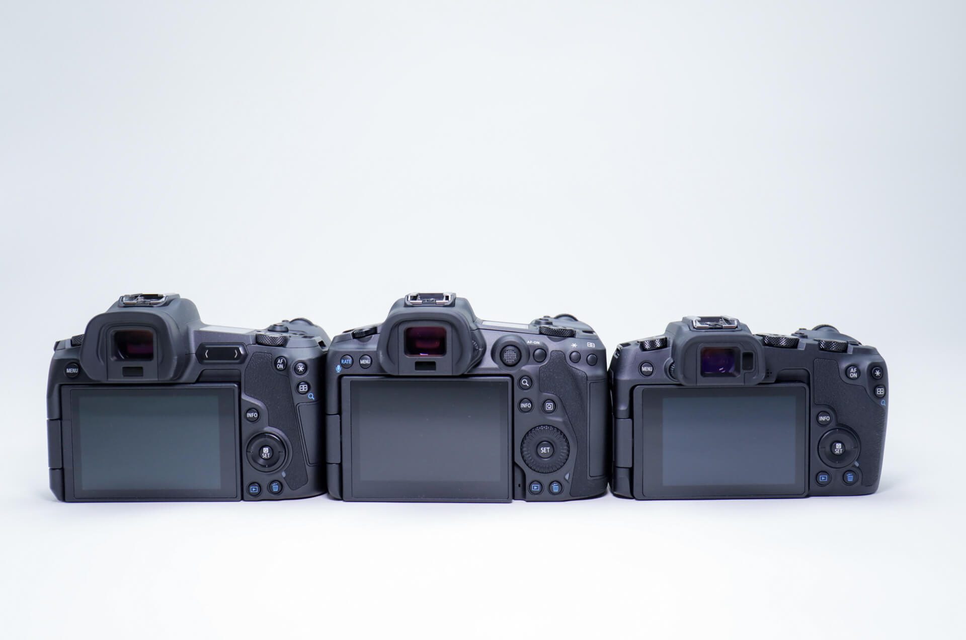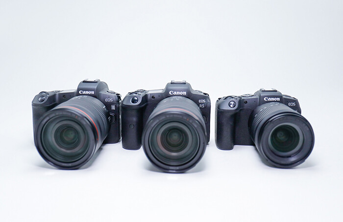Tem essa foto da R5 entre a R e a RP. Ela parece apenas um pouquinho mais volumosa que a R, sendo que a altura das duas parece a mesma, já que o viewfinder da R parece mais alto… A empunhadura também parece a mesma.