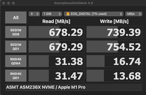 Como o leitor é USB 3.2 (10 Gb/s) esperava algo entre 800-900 MB/s de leitura e escrita. Acima de 1000 MB/s somente com leitor Thunderbolt 3.