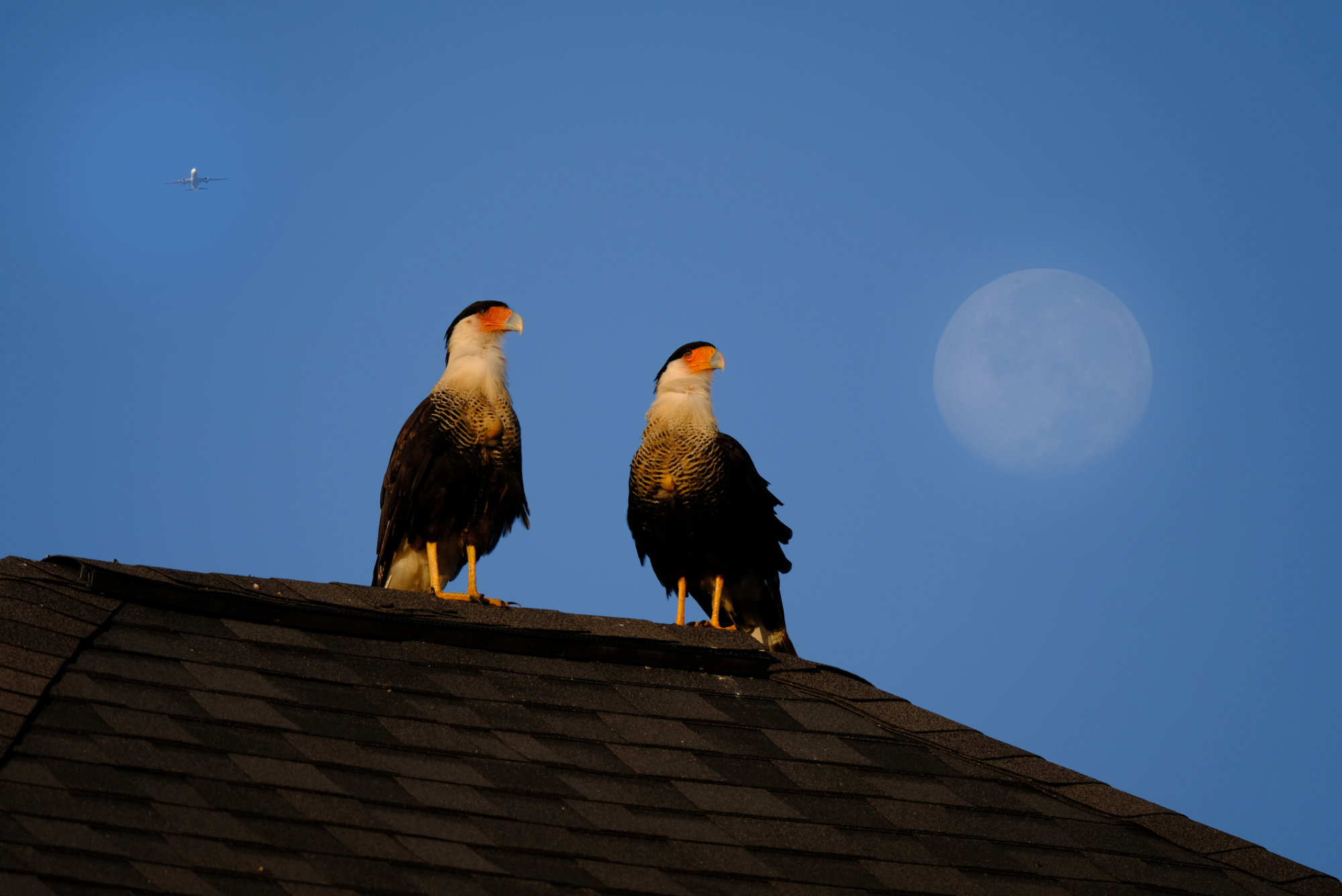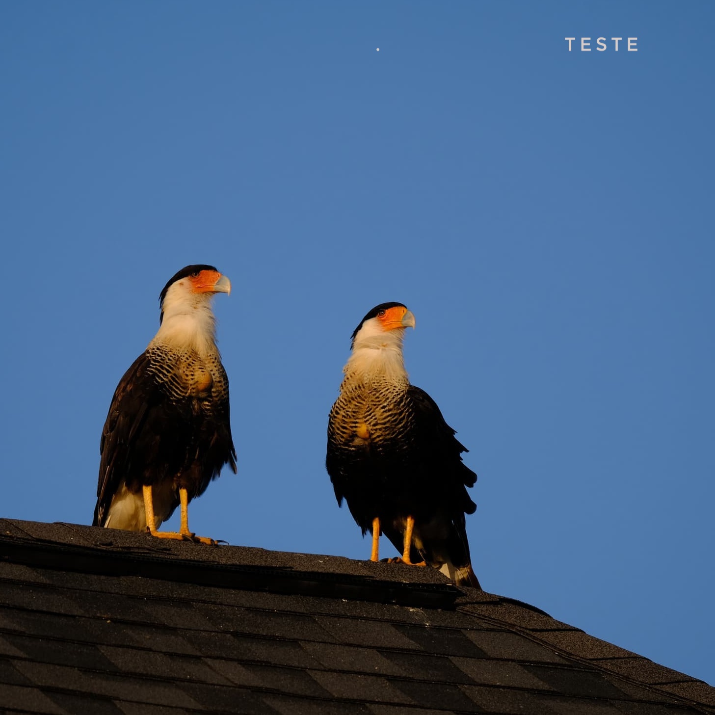 Não resisti em colocar juntos os vários elementos que estavam próximos. Pro meu gosto, ficaram elementos demais na mesma cena. Explicando, eu estava fotografando os carcarás no telhado do meu vizinho:
