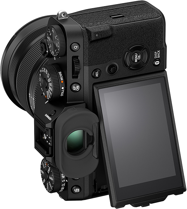 Reparem que na atual linha GFX, a Fuji optou por manter o sistema de articulação do LCD similar ao usado nas X-H1, X-T2 e X-T3. A exceção foi a GFX-50R, que usava um sistema “tilt” mais simples, similar ao usado nas X-Txx e X-E4.