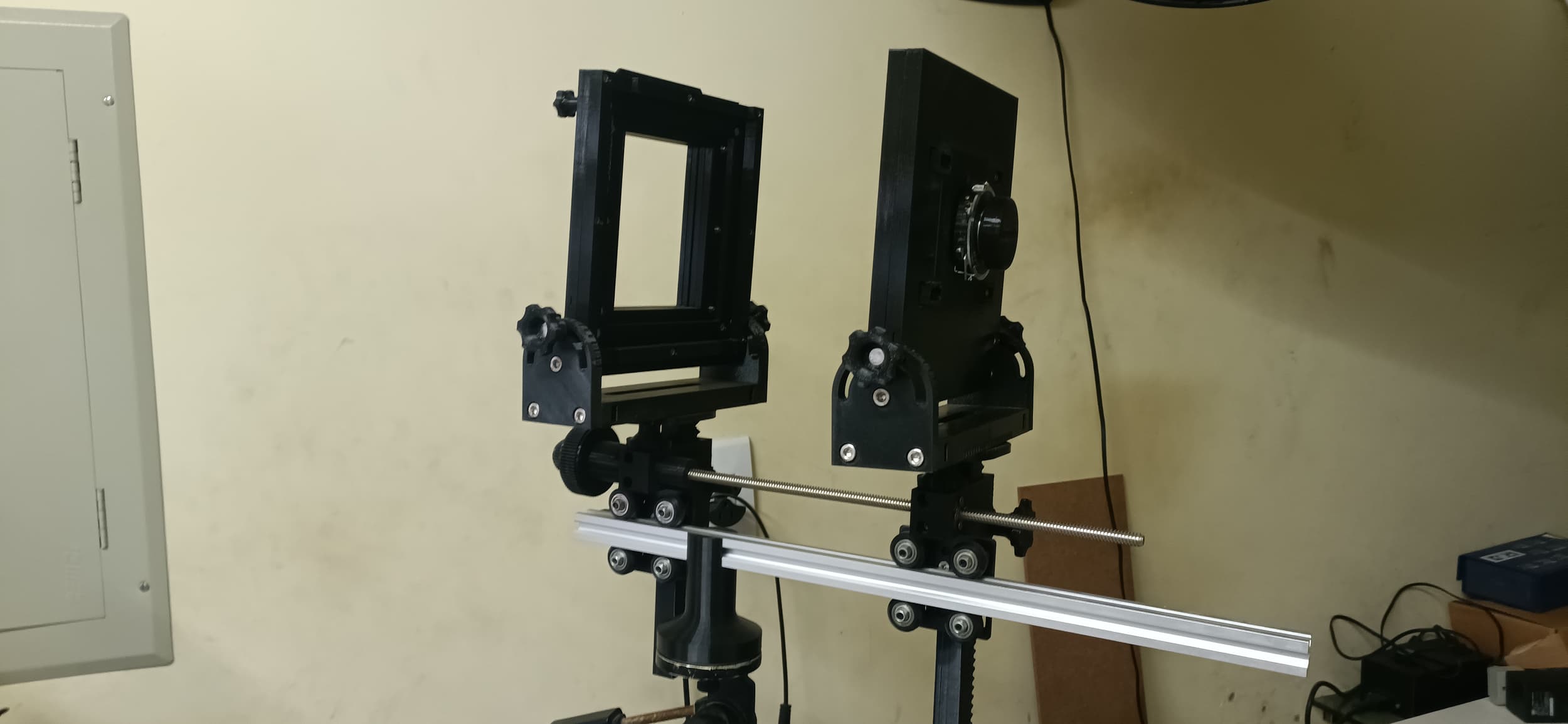 Iniciando a impressão do chassi do loader. Este é o componente mais “engenheirado” de todos. Permite a instalação em duas posições na camera, para poder fotografar tanto “portrait” quanto “landscape”. Permitirá o deslocamento da tela de focalização para permitir o encaixe do loader. Tem ainda a previsão para dois sistemas de travamento, um para a tela e outro para o loader.