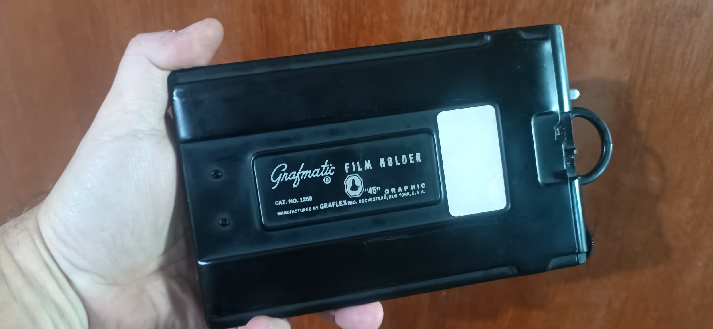 Chegou o film loader que eu estava esperando… É um Grafmatic #1268. É um loader que permite uma carga prévia de 06 (seis) chapas de filme plano. Foi um produto revolucionário em sua época, pois até então, cada loader podia ser carregado com apenas duas chapas e após o disparo, precisava ser removido da camera, invertido e recolocado.