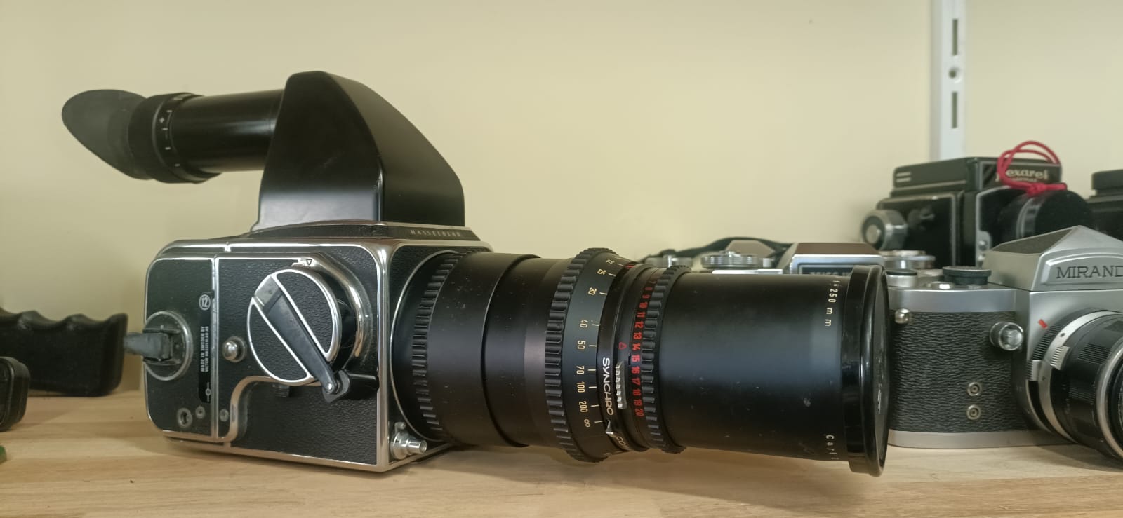 Ela veio com duas lentes, uma Carl Zeiss Distagon 60 mm e uma Carl Zeiss Sonnar 250 mm (a que está na fotografia). Veio também com o visor prismático HC-4. Dias depois que eu recebi a camera, o cara me mandou um zap com uma foto do visor capuchão perguntando se me interessava… Eu disse que fazia parte do conjunto… Está a caminho…
