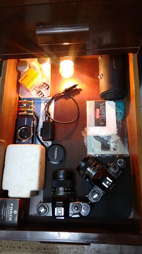 E ai pessoal, arrumei uma caixa(não sei se coloco elas ali dentro com sílica e higrômetro ) e troquei de gaveta e coloquei as Yashicas e outras coisas com uma lampada incandescente de 15W(falta a sílica e higrômetro) .