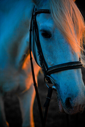 Infelizmente eu não puxei para o azul na pós. O cavalo é branco mesmo. Na foto ficou assim e só reforcei um pouco nos shadows e contraste geral