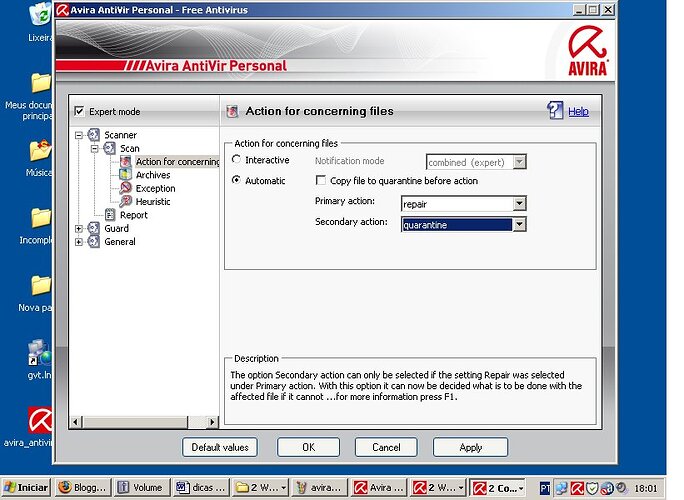 a unica coiza q eu nao gostei é que na versao 9 ao achar um virus ele manda automatico pra quarententa e nao pede oq fazer… no antigo (8.2) ele dava opcao d apagar quado detectava…