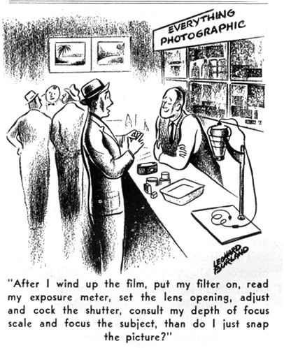 Também curto o ritual descrito no cartum quando saio para fotografar, em particular com filme. Repetindo o que já falei em algum lugar, sempre comparo isso ao pescador que usa caniço e anzol, quando poderia adquirir peixe no mercado.