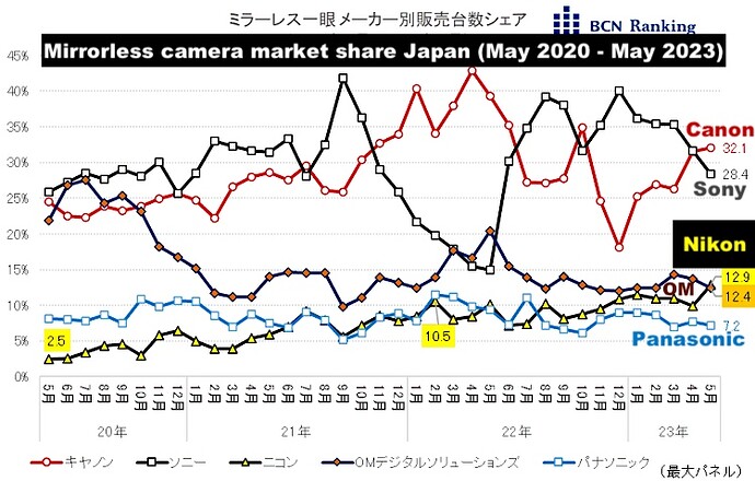 "A participação de mercado da Nikon está aumentando constantemente em câmeras de lente única sem espelho. A participação nas vendas por fabricante em maio de 2023 será de 12,9%. Ultrapassou a OM Digital Solutions (antiga Olympus) e subiu para o 3º lugar. Esta é a primeira vez em três anos que a empresa entra entre as três primeiras. Isso ficou claro a partir do “BCN Ranking”, que agrega os dados reais de vendas de varejistas de eletrodomésticos e lojas on-line.