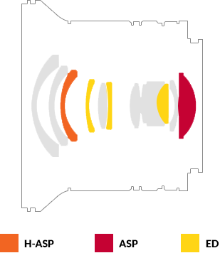 1 aspherical lens(AS), 1 hybrid aspherical lens (H-ASP) and 3 extra-low dispersion lenses(ED)