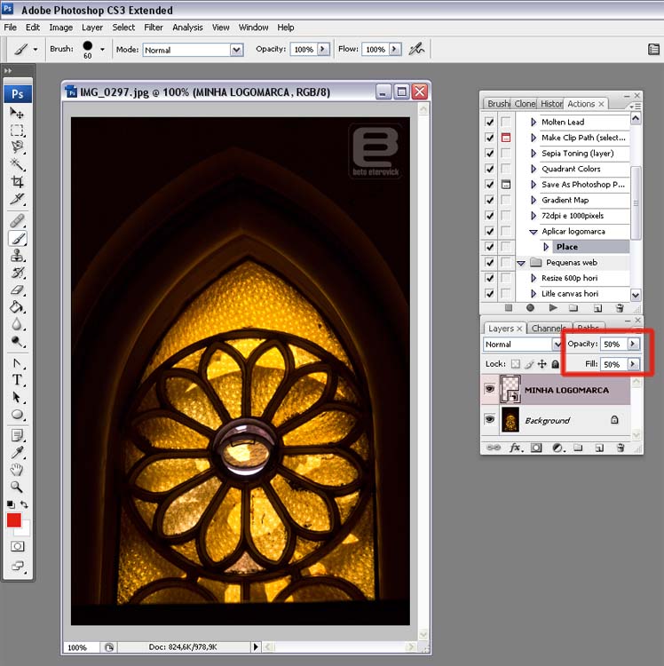 PASSO 13: Se você ainda quiser deixar sua logomarca como marca d’água , basta diminuir a opacidade e o preenchimento (Opacity e Fill), com a layer da logomarca selecionada, conforme figura abaixo. Repare que ajustei ambos para 50%, mas você pode variar, dependendo do fundo de cada foto sua.