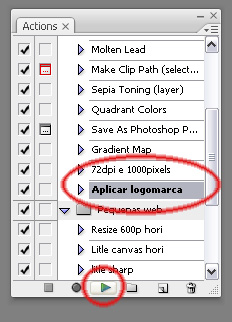 Pronto, sua action está criada. Toda vez que você for aplicar sua logomarca, basta selecionar sua action já criada e clicar no comando “Play action”, ao lado do comando “record” na caixa “Actions”, conforme figura abaixo. O Photoshop faz todo o processo automaticamente pra você.