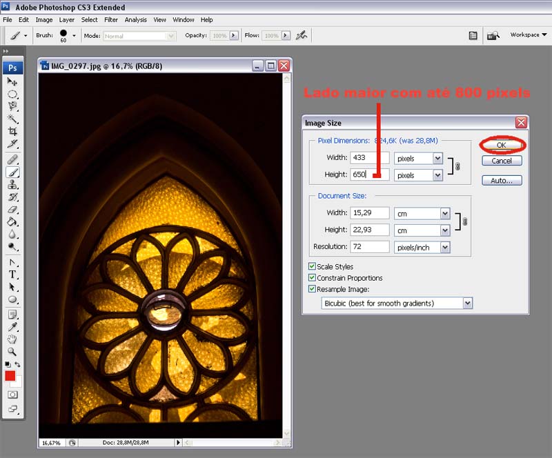 PASSO 2: Com a foto aberta, no photoshop, redimensione-a para o tamanho que você costuma postar suas fotos na net. (dica: fotos muito grandes demoram a abrir na internet e as pessoas ficam com preguiça de terminar de vê-las.)
