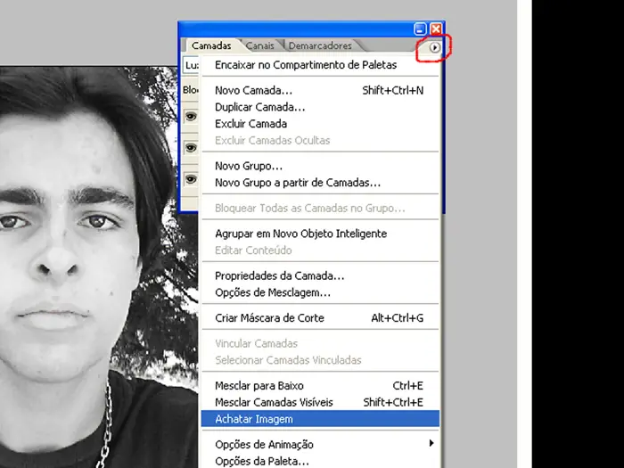 7 - Clique na setinha do lado da janela de camadas e escolha ACHATAR IMAGEM