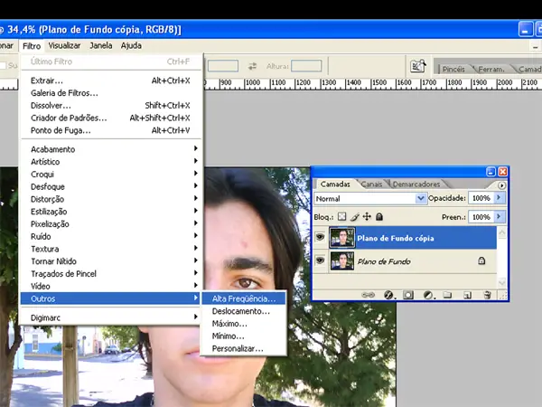 2- Com a camada cópia selecionada, vá para FILTRO>OUTROS>ALTA FREQUÊNCIA.
