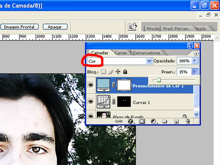 13- Mude o modo dessa camada para COR e ajuste a porcentagem de preenchimento. Como a minha foto estava muito clara, eu deixei em 15%. Mas você pode variar.