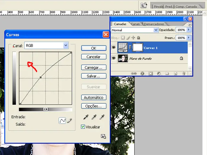 10-Eu subi a linha só um pouco porque a minha imagem já estava muito clara, mas você pode subir mais se a foto estiver mais escura. O ideal é centrar a cluz nos olhos.Depois de clicar OK, aperte CTRL+I. A imagem vai ficar levemente mais escura e você vai perceber que o quadradinho da camada Curvas vai ficar preto.