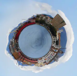 Uma dica, para que a imagem não fique com desencontros, sugiro que arrastem uma linha azul que fica oculta na régua superior e esquerda. No caso use a régua superior e arraste a linha até certo ponto da imagem. Dê um Ctrl+T e gire a mesma até que o horizente pareça alinhado pressione Enter, e siga o tuto da daniteixeira.